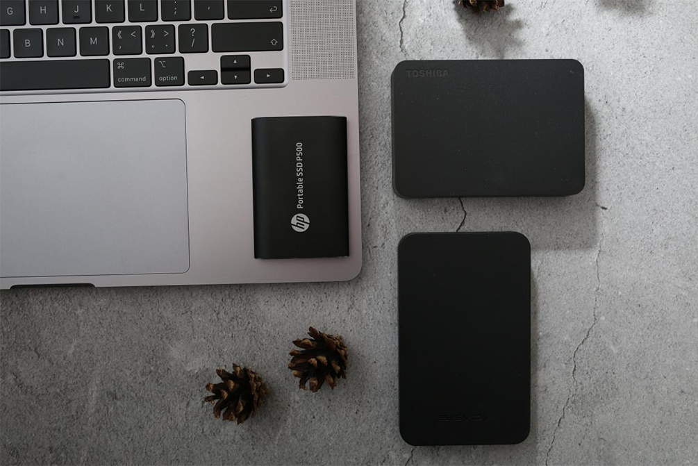 從上到下看,惠普P500兩邊做了圓潤的處理,握在手里也很小,有點像一塊“肥皂”。下面是我在用的三個移動硬盤對比圖,右側的是4TB的東芝機械硬盤,左面的是撿垃圾的256GB移動硬盤放到硬盤盒里,中間自然是惠普P500了。
