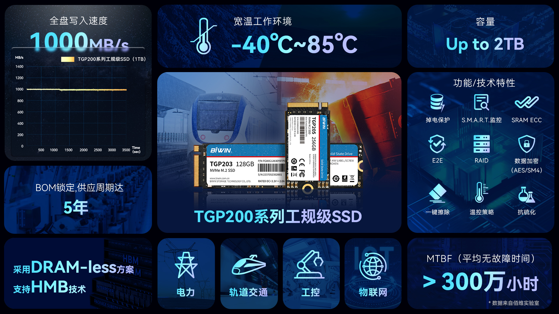 近日,佰維存儲面向軌道交通、工控、數(shù)據(jù)通信、電力等工業(yè)領(lǐng)域,推出了工規(guī)級寬溫SSD——TGP200系列。TGP200系列SSD采用了DRAM-Less設(shè)計,兼顧-40°C~85°C寬溫工作、-55°C~95°C寬溫存儲、斷電保護(PLP)等特性,MTBF高達300萬小時,讀寫速度分別高達3400MB/s、2900MB/s,滿足嚴(yán)苛工業(yè)環(huán)境下數(shù)據(jù)高效可靠存儲要求。